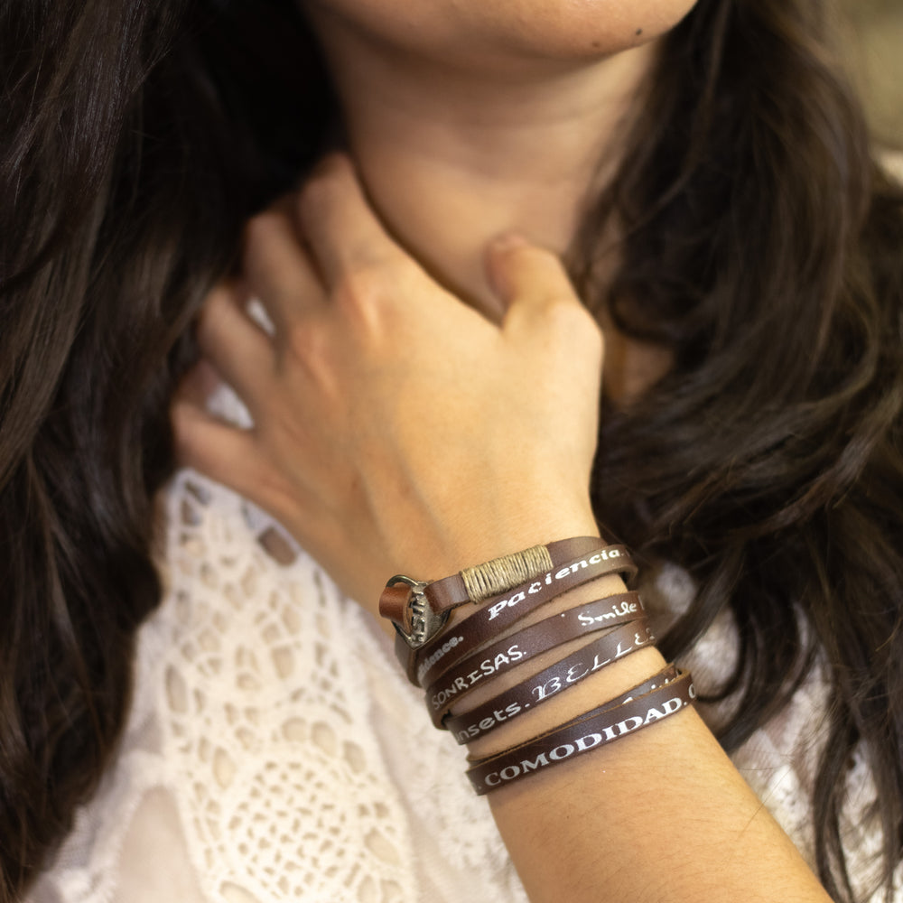 Pulsera unisex de cuero hecha a mano. Grabada con buenos deseos. Con un agarre deslizante para un tamaño totalmente ajustable.