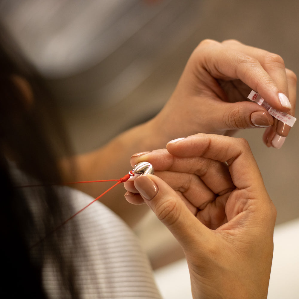 Red cord with a small silver fortune cookie charm. It includes several fortunes so the wearer can change them, but we can also customize the fortune, making it a highly desirable gift.
